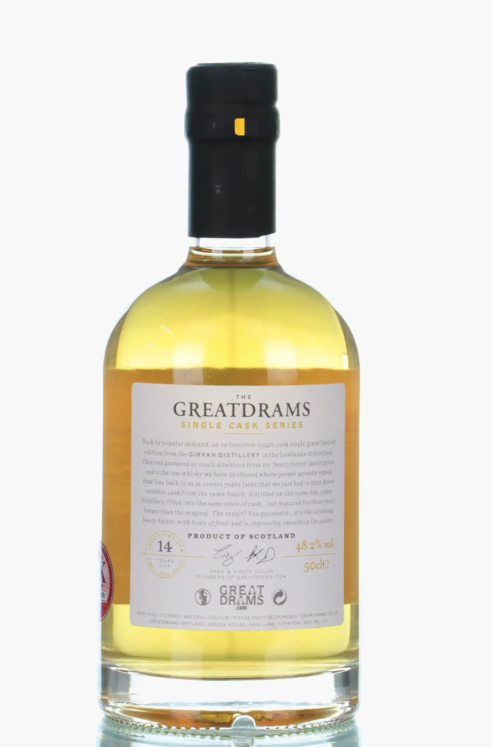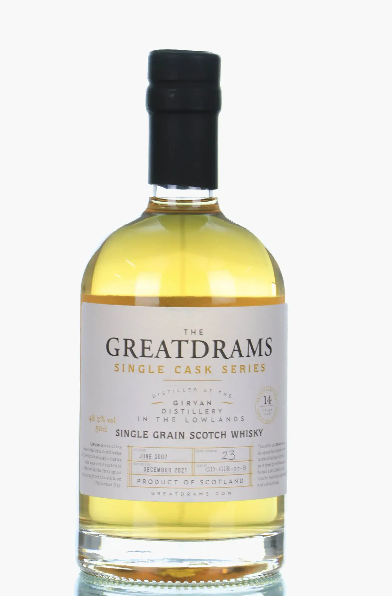 A 14 year old bottling of Girvan single grain bottled by Greatdrams.com for their Single Cask series. A single ex-bourbon cask filled in June 2007 and bottled in December 2021. Individually numbered bottles.