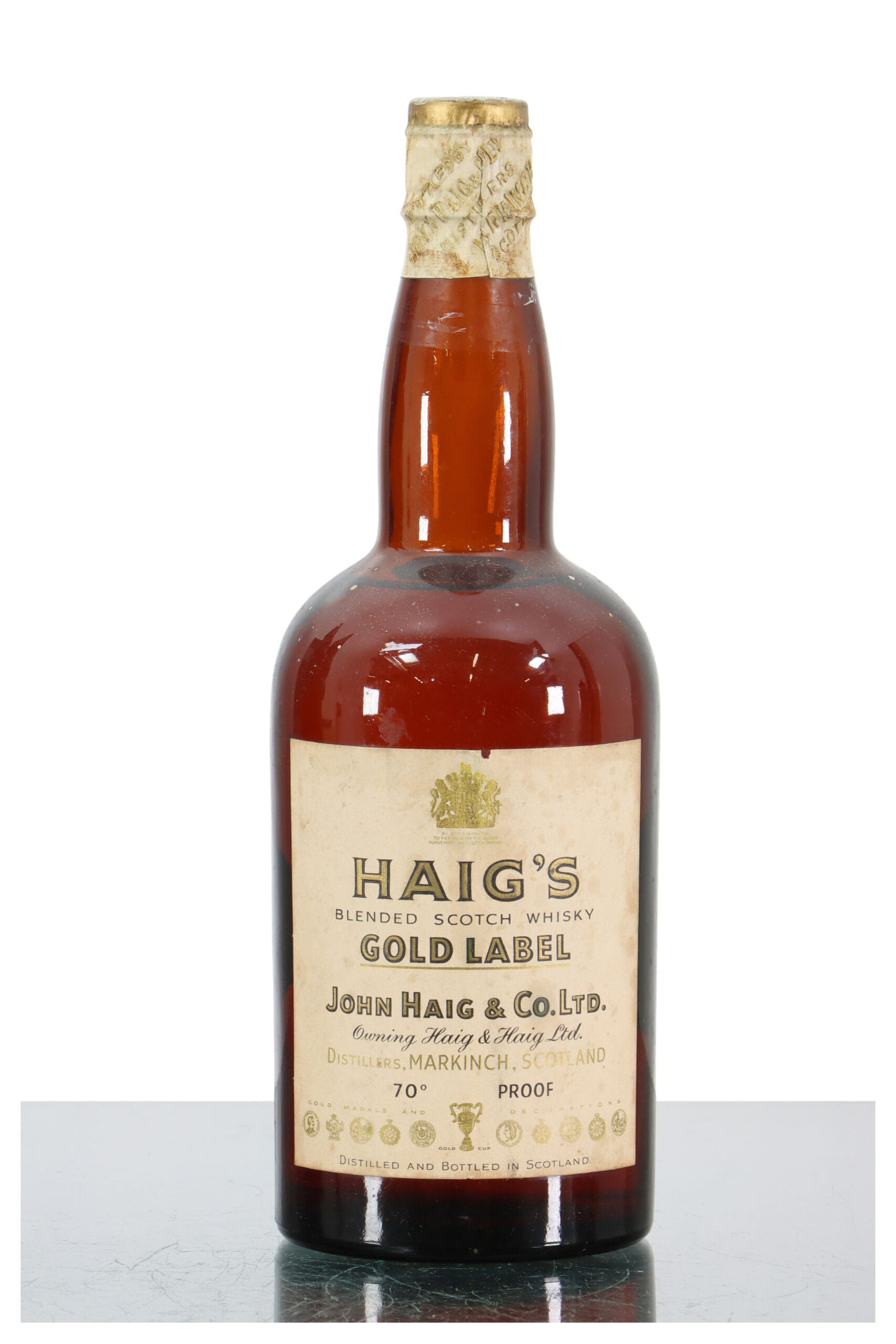 A rare old bottling of Haig’s Gold Label blended whisky, released back in the 1950s and closed with a spring cap. Distilled in Markinch at 70% ABV. This one is truly special for your collection. Visible aging on label as expected with the age of this special bottle.