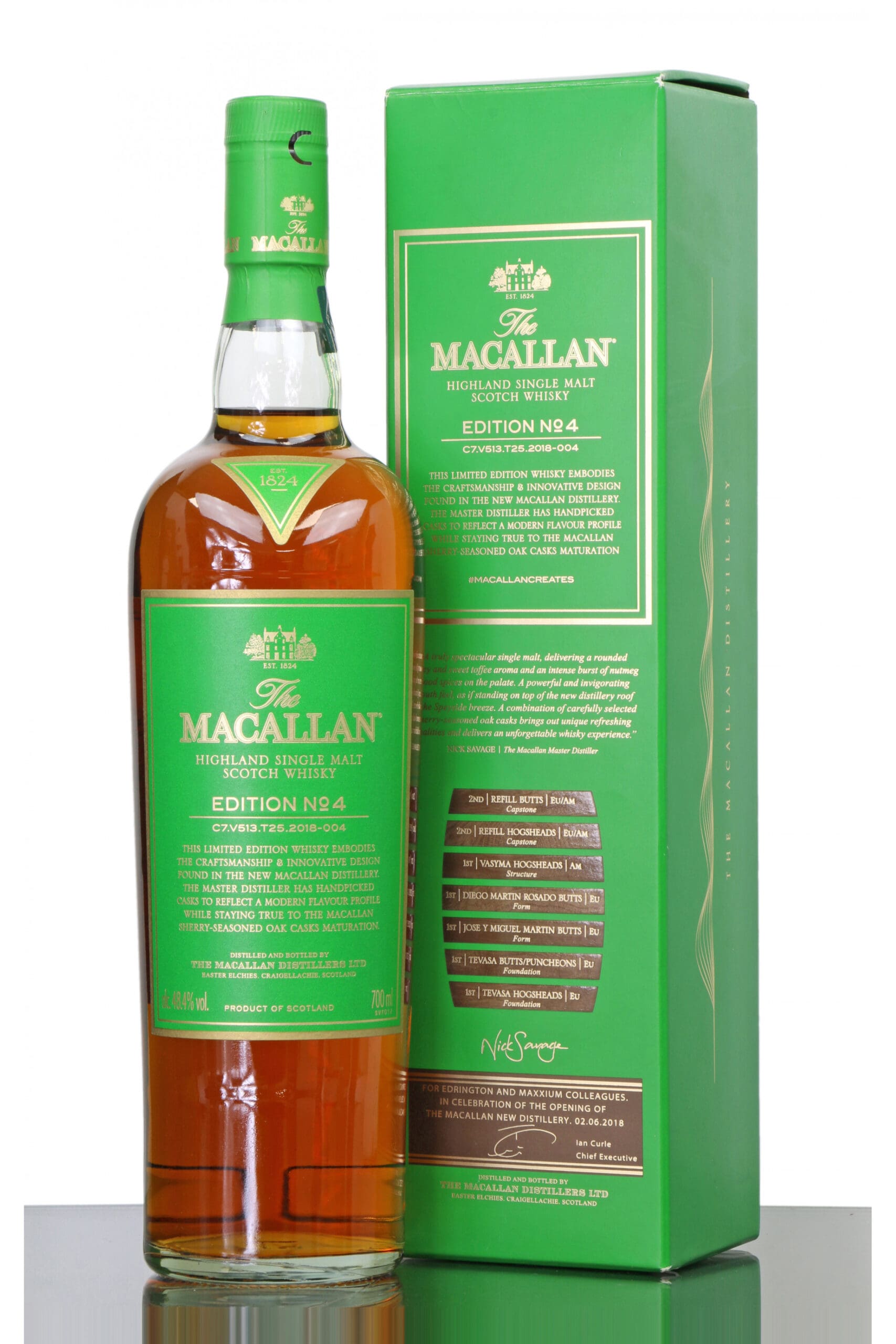 The Macallan Edition No.4 if the fourth release from the Macallan Edition series. This Speyside single malt is a celebration of distillery’s whisky making heritage, combing a unique selection of sherry oak cask styles. Edition No.4 reflects the craftmanship and pioneering design of the new magnificent Macallan Distillery. This release was for Edrington and Maxium colleagues, in celebration of the opening of the new distillery on 02.06.2018. Aromas of sweet honey and toffee with an intense burst of nutmeg wood spices on the palate. A powerful and invigorating mouth feel, as if standing on top of the new distillery roof in the Speyside breeze.